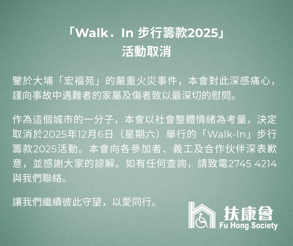 作為這個城市的一分子,本會以社會整體情緒為考量,決定取消於2025年12月6日(星期六)舉行的「Walk-In」步行籌款2025活動。本會向各參加者、義工及合作伙伴深表歉意,並感謝大家的諒解。如有任何查詢,請致電2745 4214與我們聯絡。