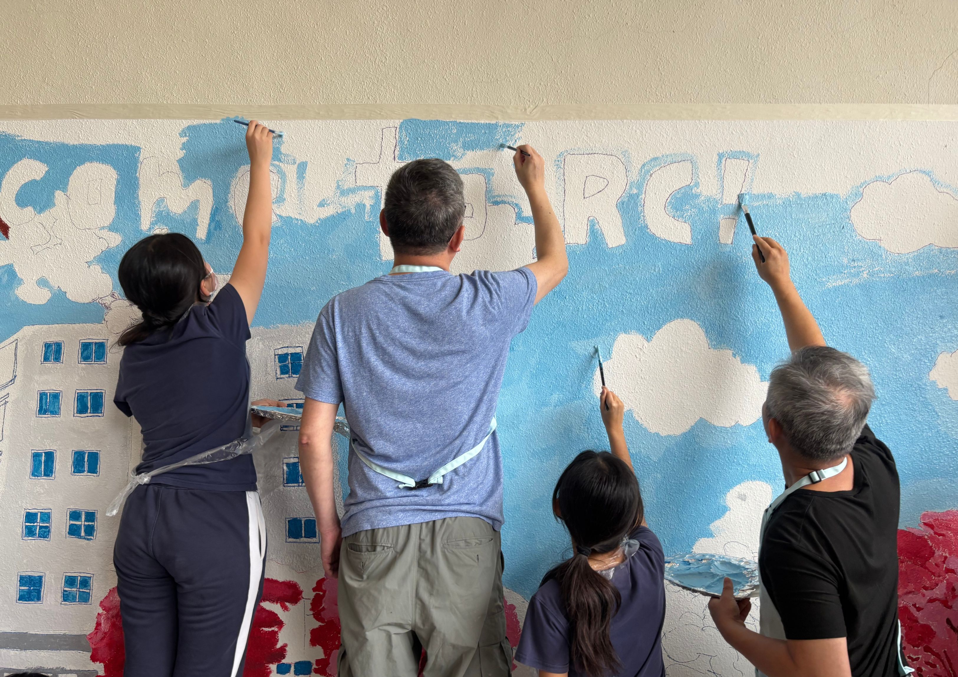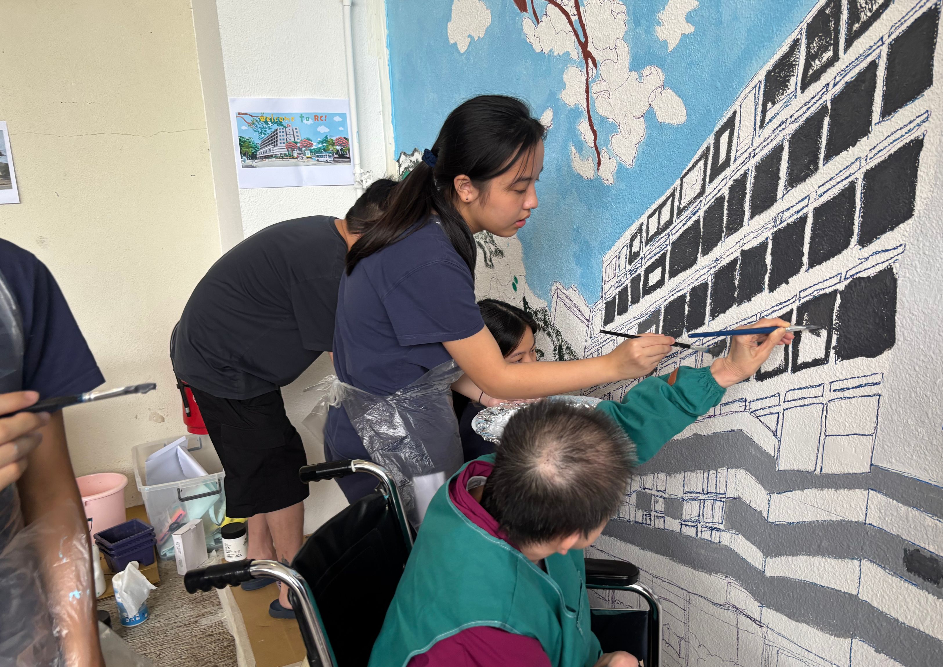 活動更獲拔萃女書院學生熱心參與,共同繪製出康復中心的「打卡新地標」!這不只是藝術,更是扶康會核心價值的最佳示範:協同效應(Synergy)。跨單位、跨界別的合作,讓「一加一大於二」的理念化為現實,創造出遠超個人力量的美麗成果;牆畫不只是美化環境,更展現了共融、合作、積極參與的精神。